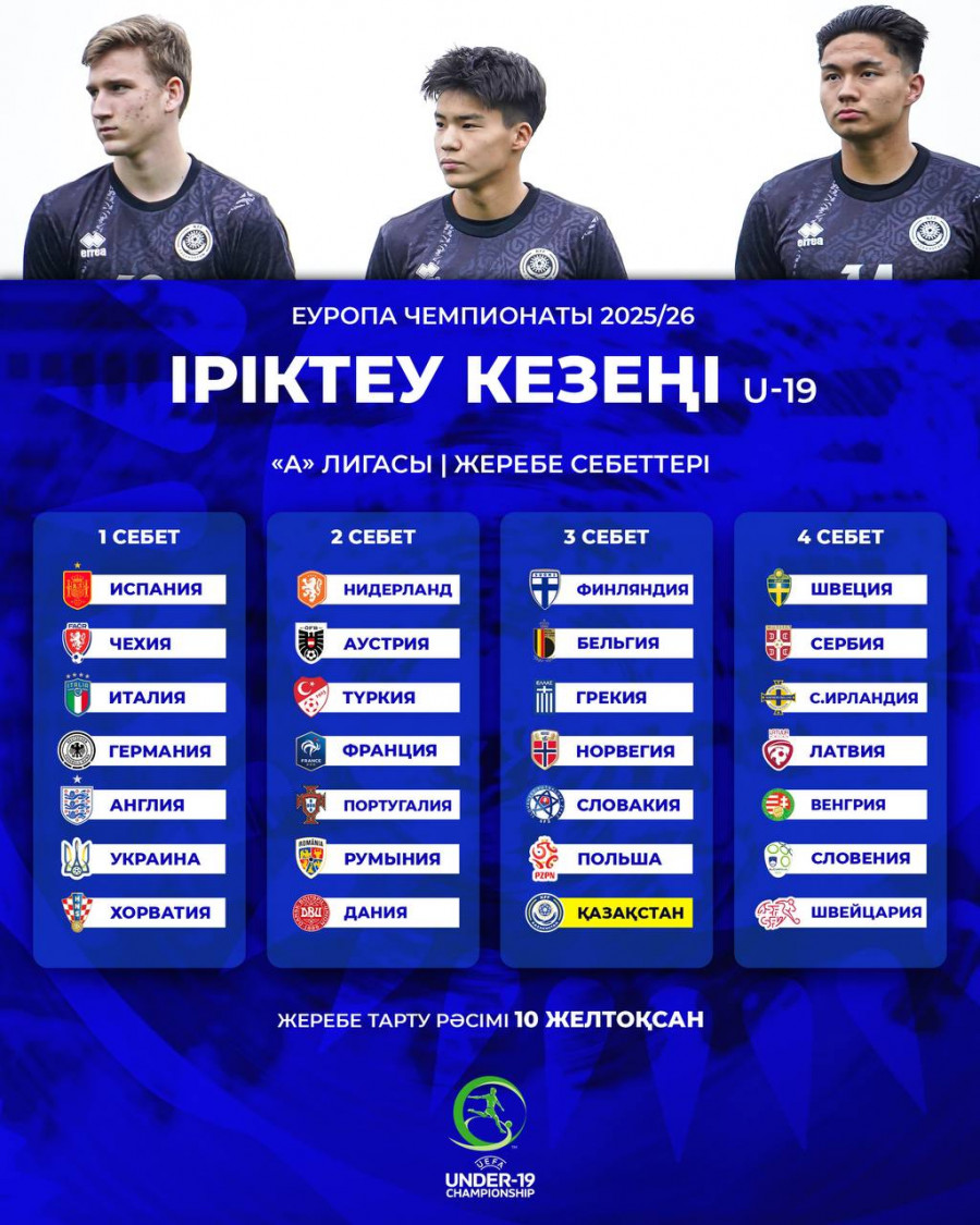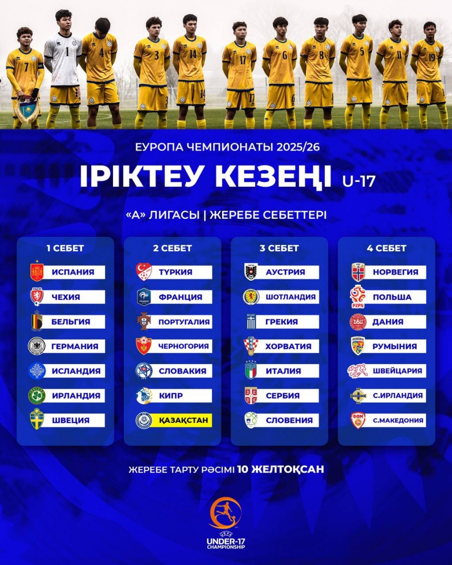 Сегодня, 10 декабря, в Ньоне состоится жеребьёвка квалификационного раунда ЕВРО–2026, в котором примут участие молодежные сборные Казахстана U-17 и U-19.